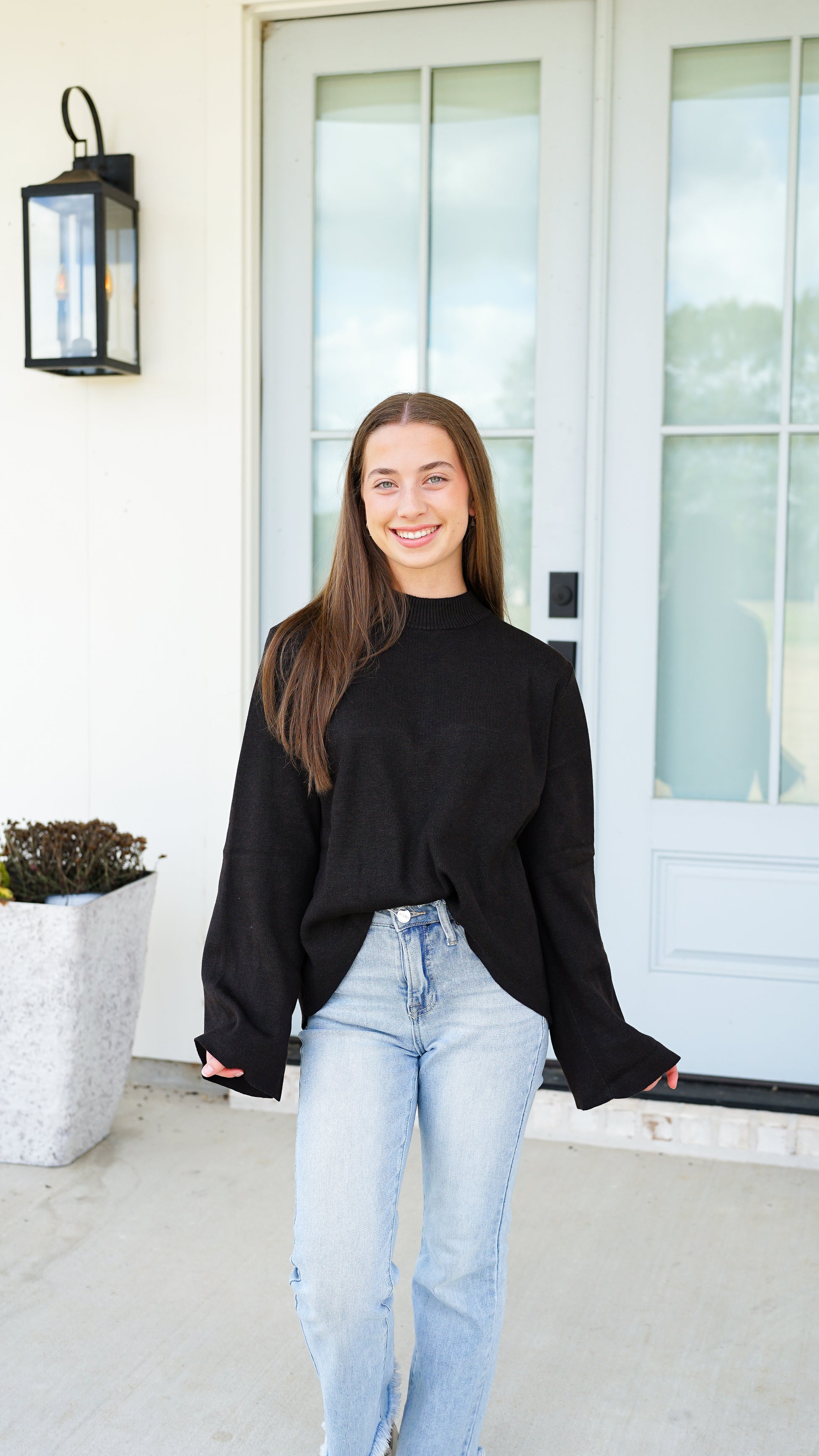 ~ Features a crew neck, long bell sleeves, and a longer length in the back