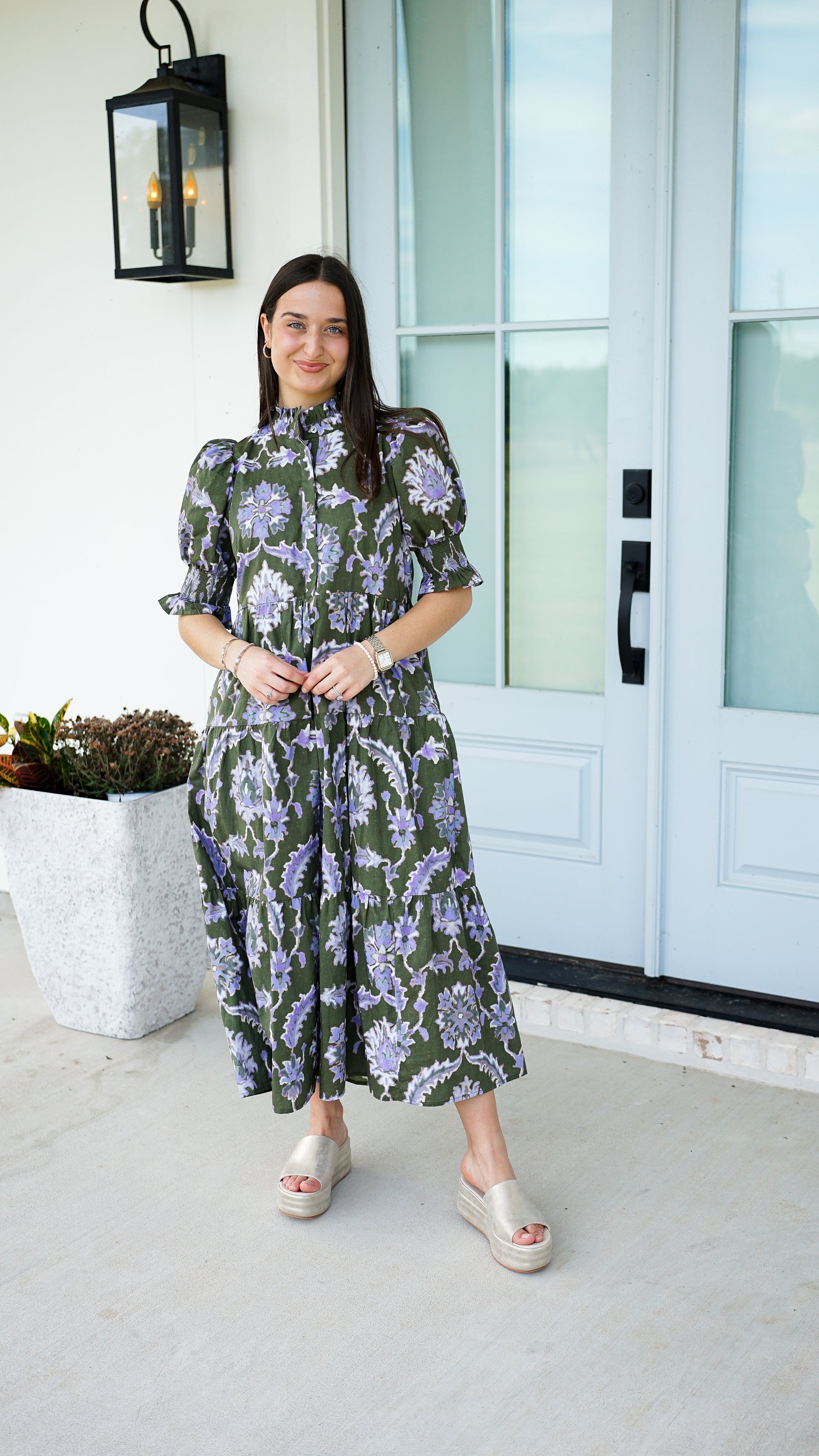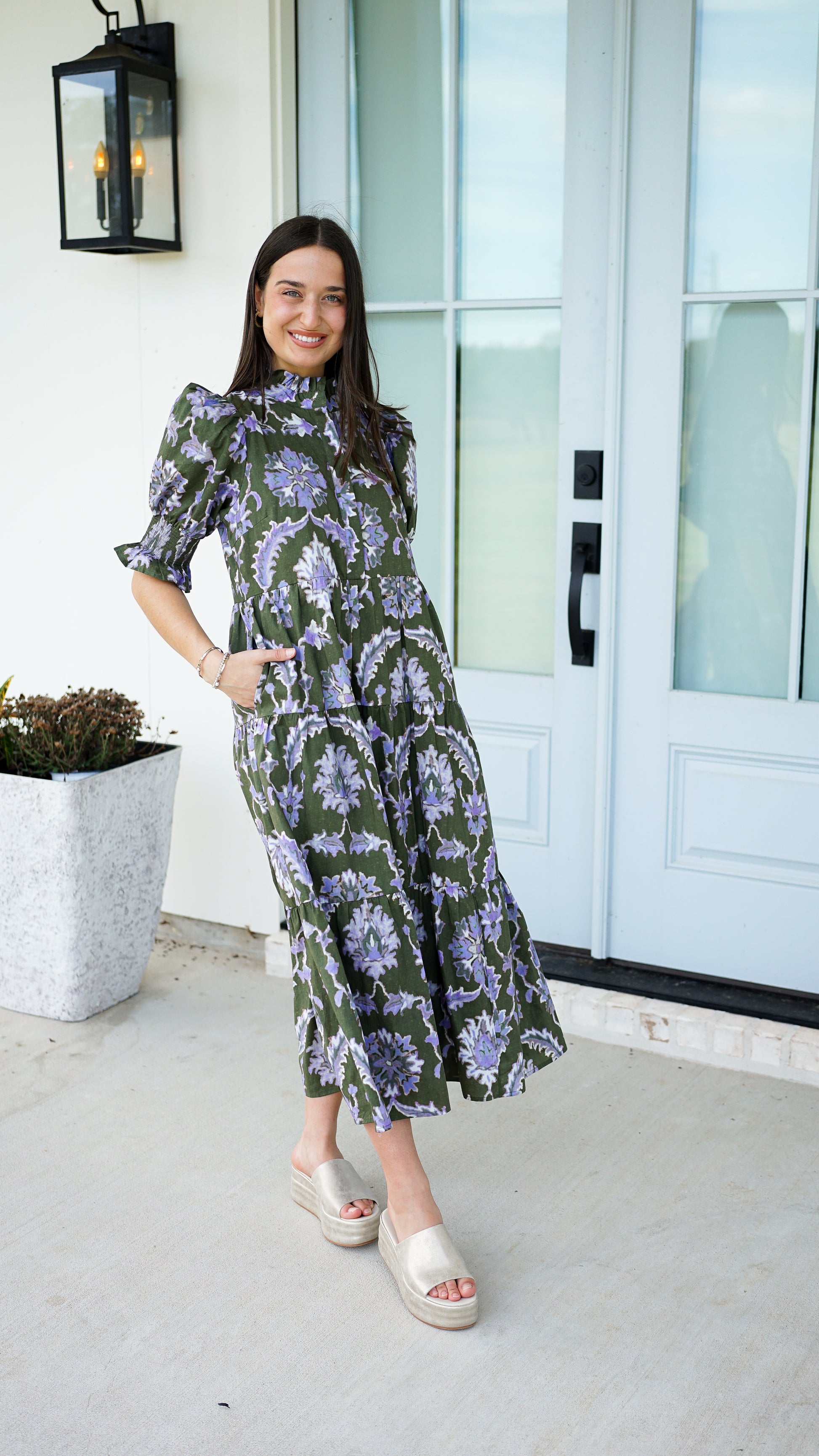 ~ Features perfect puff sleeves, pockets, hidden buttons down the front (top half), and a beautiful ruffle tiered bottom