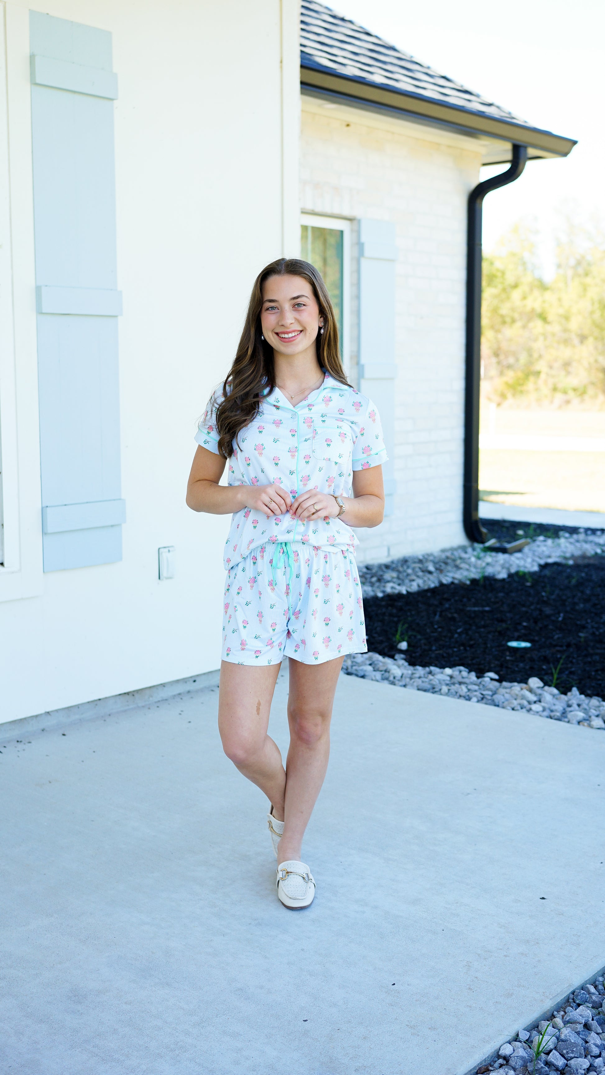~ The softest, super cute teal pin striped comfy pajamas with dainty pink floral arrangements